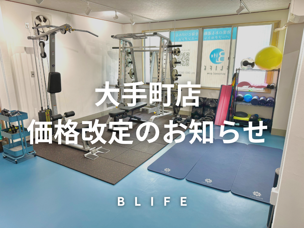 - <h3 start="56" end="71">【価格改定のお知らせ】</h3><h3 start="58" end="73"><p start="73" end="112"><span style="font-weight:normal">いつもパーソナルジムBLIFEをご利用いただき、誠にありがとうございます。</span></p> <p start="114" end="208"><span style="font-weight:normal">このたび </span>大手町店<span style="font-weight:normal"> におきまして、</span><br start="135" end="138"><span style="font-weight:normal"> サービス内容の充実および指導品質のさらなる向上を目的に、</span><br start="166" end="169"> <span start="169" end="192" style="font-weight:normal">2025年11月1日より料金を一部改定</span><span style="font-weight:normal">させていただくこととなりました。</span></p> <p start="210" end="297"><span style="font-weight:normal">なお、</span>現在ご在籍中の会員様につきましては、これまでどおりの料金でご利用いただけます。<br start="256" end="259"><span style="font-weight:normal"> (新料金は2025年11月1日以降に新しくご入会される方が対象となります。)</span></p> <p start="299" end="394"><span style="font-weight:normal">これまで以上にご満足いただけるトレーニング環境とサポートを提供できるよう、<br start="336" end="339"> スタッフ一同努めてまいります。<br start="354" end="357"> また、袋町店・千田店につきましては、引き続き現行料金にてご案内いたします。</span></p> <p start="396" end="429"><span style="font-weight:normal">今後ともパーソナルジムBLIFEをどうぞよろしくお願いいたします。</span></p> <br></h3><br>